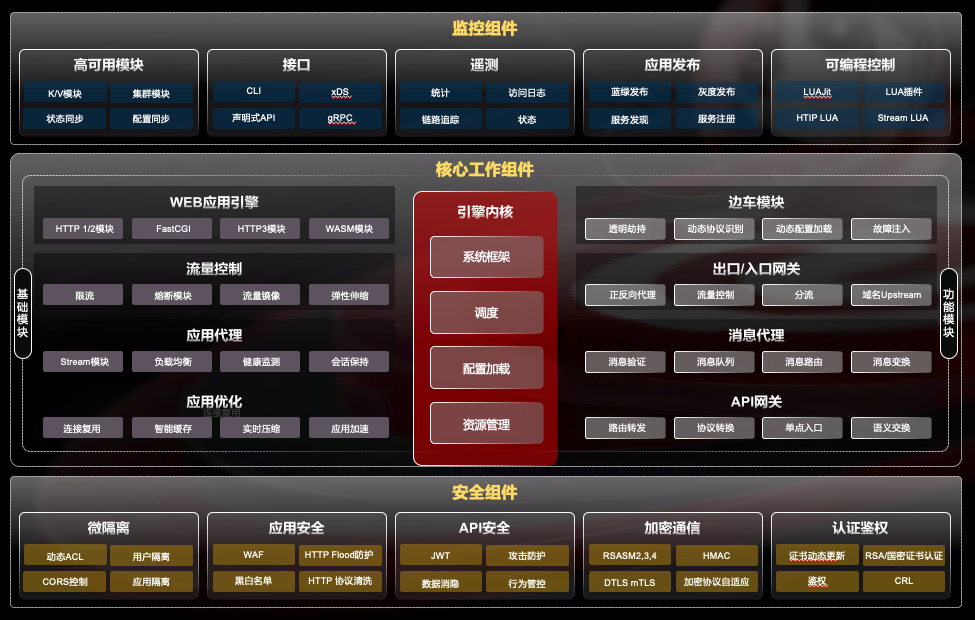 李刚强调,“OpenNJet 充分吸收了开源生态的优秀扩展模块 ,在功能规划上包含了5大类18类组件,特别是随着安全威胁的快速增加,规划了安全组件。除安全功能外,‘企业特性’也是OpenNJet关注的重点领域,如内置的高可用性,自动化的集群发现及配置同步等。”